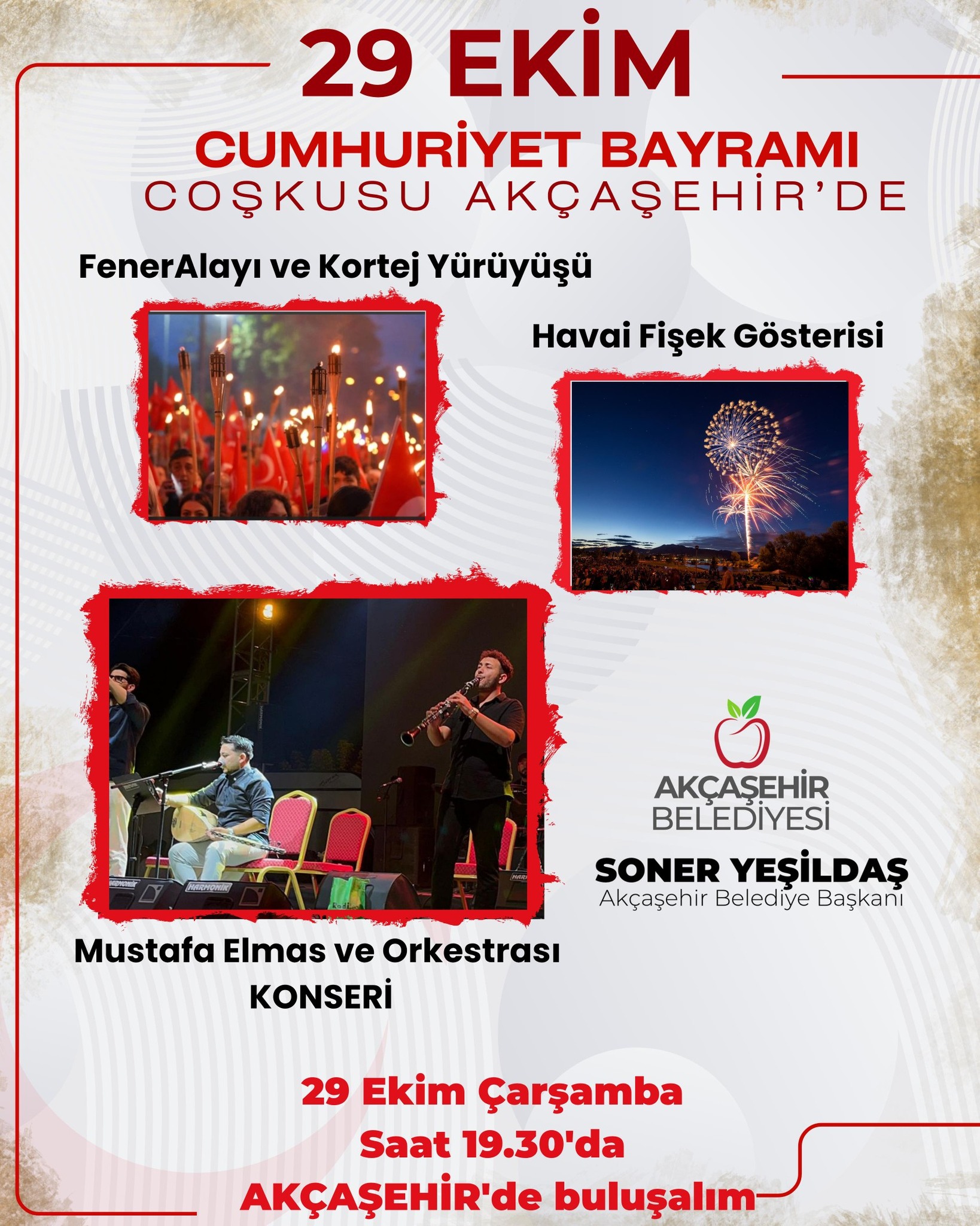 Cumhuriyetimizin ilanının 102. yılı, Akçaşehir’de büyük bir coşku ve gururla kutlanacak. Akçaşehir Belediyesi tarafından düzenlenen 29 Ekim Cumhuriyet Bayramı programı, fener alayı, kortej yürüyüşü, havafişek gösterisi ve Mustafa Elmas ve Orkestrası konseriyle taçlandırılacak.