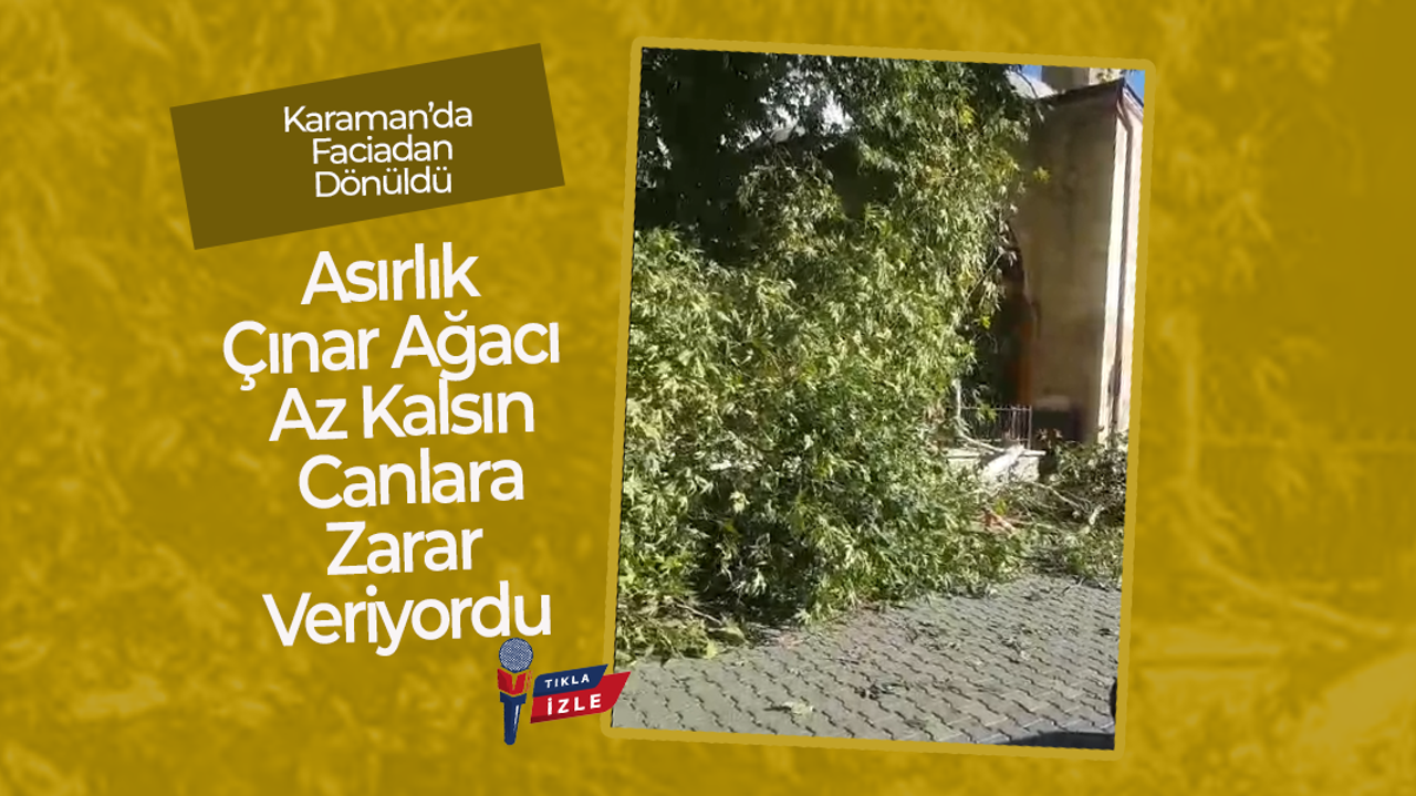 Karaman Yeni Minare Camisi avlusunda bulunan, en az bir asırlık olduğu tahmin edilen çınar ağacının büyük bir dalı bugün aniden kırıldı. Meydana doğru devrilen dal, kısa süreli panik yaşanmasına neden oldu.