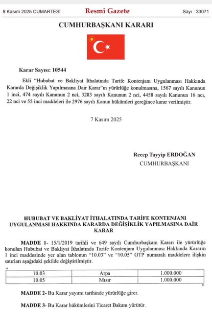 Resmî Gazete’nin bugünkü sayısında yayımlanan 10544 sayılı Cumhurbaşkanı Kararı ile, “Hububat ve Bakliyat İthalatında Tarife Kontenjanı” kapsamında arpa ve mısırda her biri 1 milyon ton olmak üzere toplam 2 milyon tonluk yeni ithalat kotası tanımlandı. Bu kararla birlikte mısırda sadece 2025 yılı içinde dördüncü kez 1 milyon tonluk ithalat izni verilmiş oldu.