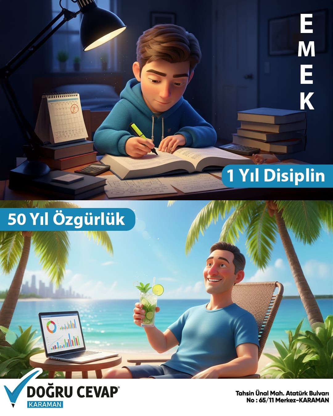 Karaman’da eğitim alanında adını başarılarla duyuran Doğru Cevap Eğitim Kurumları, öğrencilerine yönelik dikkat çekici bir motivasyon çalışmasıyla gündeme geldi. Hazırlanan görselde, “1 Yıl Disiplin – 50 Yıl Özgürlük” sloganı öne çıkarılarak gençlere emek, sabır ve azmin hayat boyu sağlayacağı kazanımlar anlatıldı.