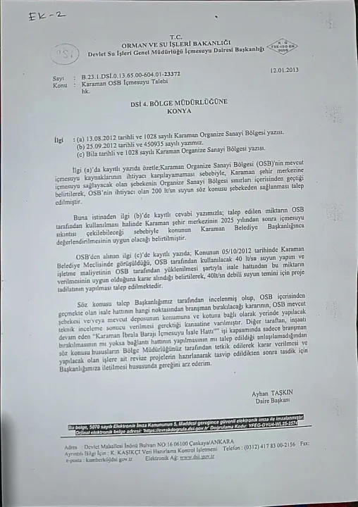 Avukatların araştırmasında dikkat çekici bir ayrıntı da Devlet Su İşleri’nin 2013 yılında hazırladığı rapor oldu. Raporda, OSB’nin içme suyu hattından saniyede 200 litre su talep etmesi halinde 2025 yılından itibaren şehir merkezinde su sıkıntısı yaşanabileceği uyarısı yer alıyor.