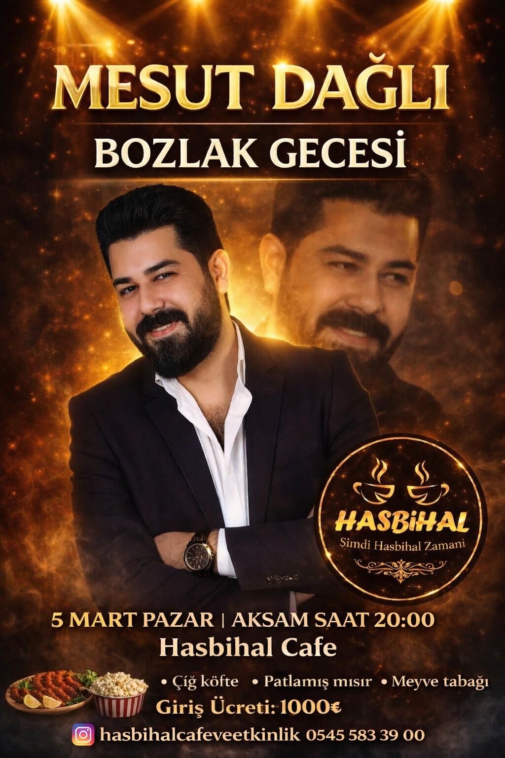 Duyguların müzik notalarına döküldüğü Hasbihal Cafe'de, sesi ve yorumuyla gönüllerin dostu olan ünlü sanatçı Mesut Dağlı sahne alacak. Yöresel ezgilerimiz ve bozlak havalarıyla dinleyicilere unutulmaz bir müzik şöleni sunacak olan "Bozlak Gecesi", 5 Nisan Pazar günü saat 20.00'da başlayacak.