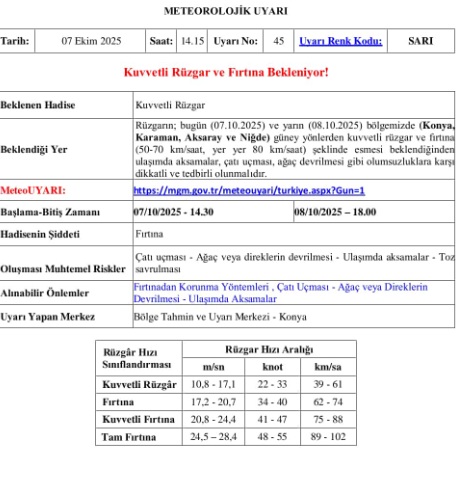 Meteoroloji 8. Bölge Müdürlüğü (Konya) tarafından yapılan açıklamada, 7 Ekim Salı günü saat 14.30’dan itibaren başlayarak 8 Ekim Çarşamba günü saat 18.00’e kadar Karaman, Konya, Aksaray ve Niğde genelinde güney yönlerden 50 ila 70 km/saat, yer yer 80 km/saat hızla esmesi beklenen rüzgar ve fırtınaya karşı uyarı yapıldı.