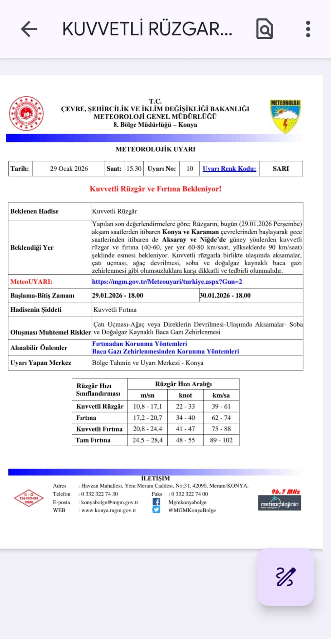 T.C. Çevre, Şehircilik ve İklim Değişikliği Bakanlığı Meteoroloji Genel Müdürlüğü 8. Bölge Müdürlüğü, Karaman için kritik bir Meteorolojik Uyarı yayınladı. 29 Ocak 2026 (Bugün) tarihli raporda, uyarının rengi "SARI" olarak belirlendi.