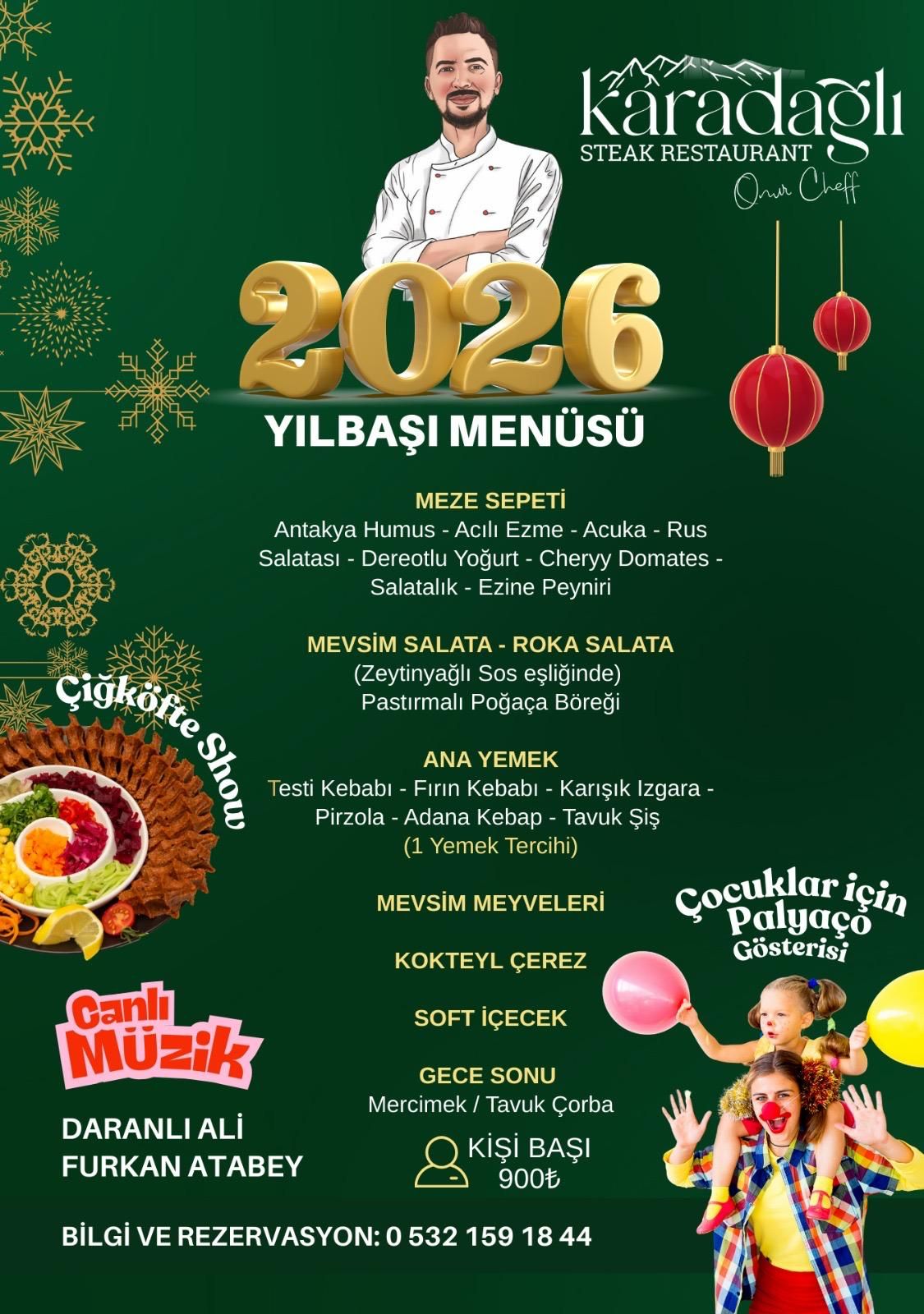 Karaman’ın gastronomi alanındaki markalarından Karadağlı Steak Restaurant, 2026 yılına girerken misafirlerine unutulmaz bir gece yaşatmaya hazırlanıyor. Şehrin gürültüsünden uzak ama eğlencenin tam kalbinde olmak isteyenler için hazırlanan programda yok yok.