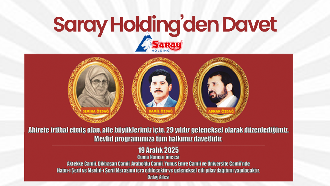 Karaman sanayisinin öncü kuruluşu ve şehrin markası Saray Holding, kurucu Özdağ ailesinin ebediyete irtihal eden değerli büyüklerini anmak için anlamlı bir program düzenliyor. Özdağ ailesi, düzenlenecek olan Hatim-i Şerif ve Mevlid-i Şerif merasimine tüm Karaman halkını davet etti.