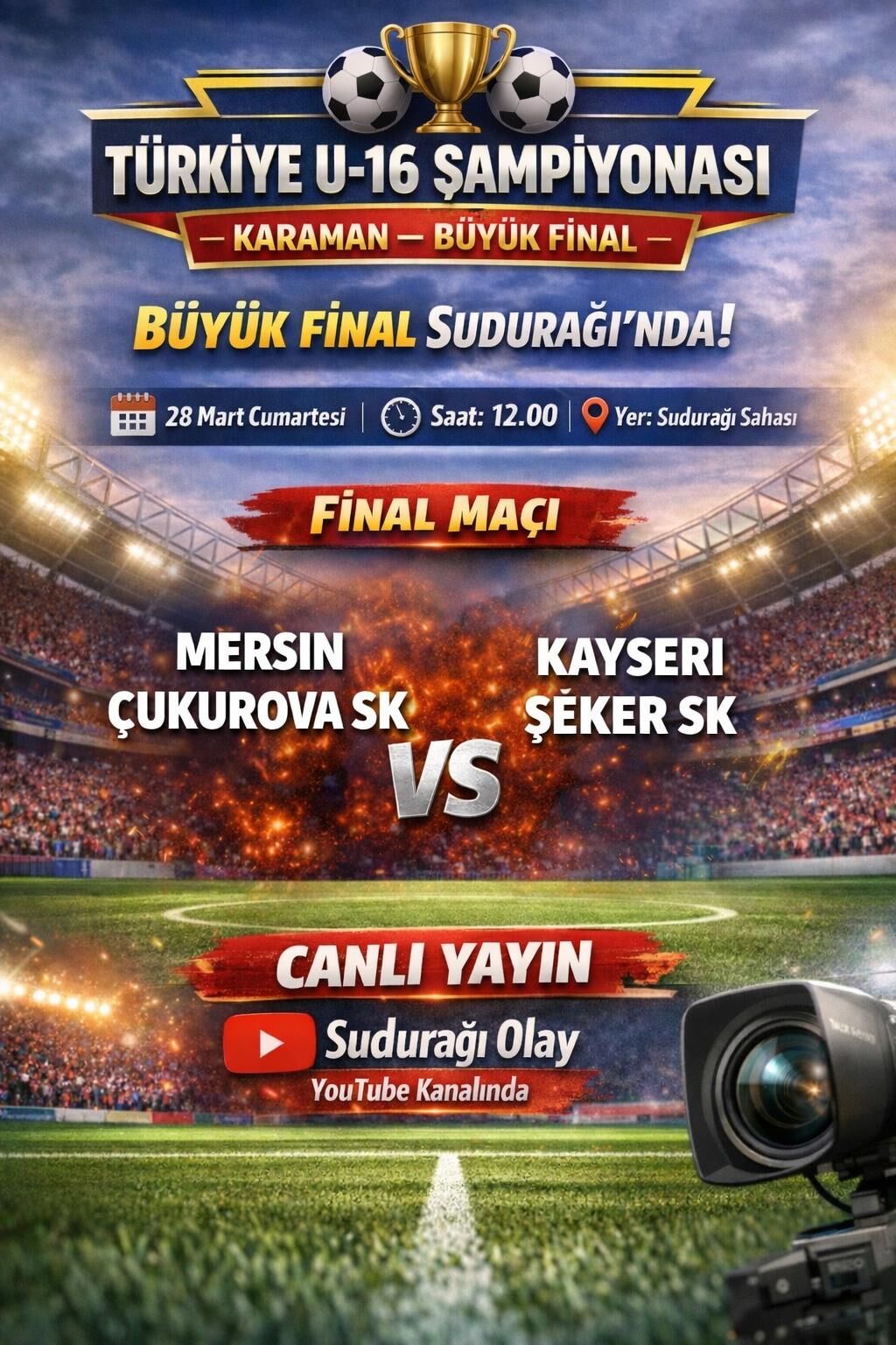 Karaman'ın Sudurağı beldesi, tarihinde ilk kez bu çapta büyük bir spor organizasyonuna ev sahipliği yapmanın gururunu yaşıyor. U-16 Türkiye Şampiyonası'nın şampiyonunu belirleyecek dev finalde Mersin Çukurova SK ile Kayseri Şeker SK karşı karşıya gelecek. Bu tarihi maç, "Sudurağı Olay" YouTube kanalından da canlı yayınlanacak.