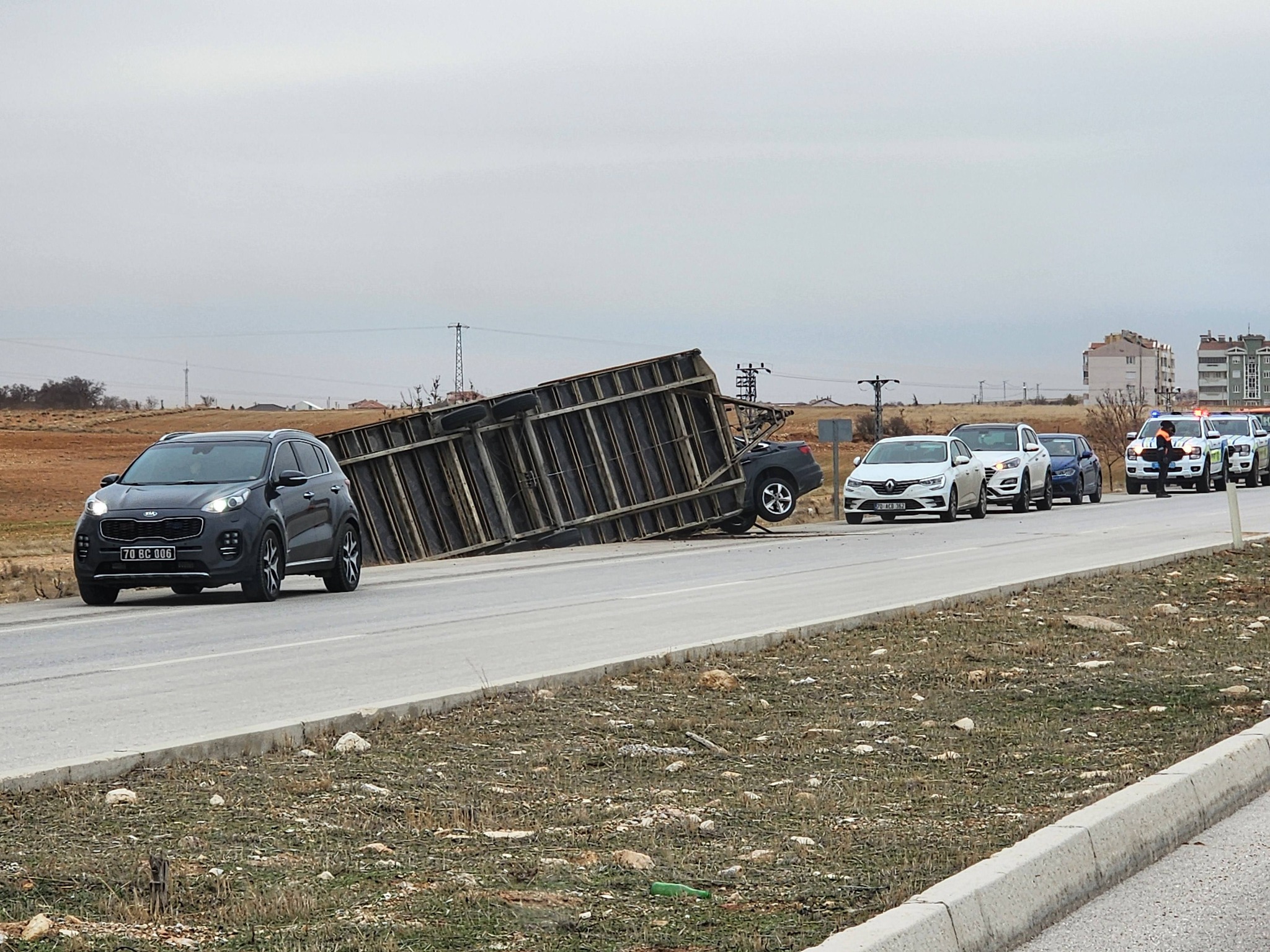 Edinilen bilgilere göre; fırtınanın en etkili olduğu Karaman-Konya yolunda seyir halindeki bir kamyonet, rüzgarın şiddetiyle savrulmaya başladı. Sürücüsünün kontrolünden çıkan kamyonet yol kenarına devrilirken, arkasındaki römork koparak karşı şeride fırladı.
